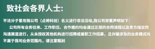 點(diǎn)將(上海)科技股份有限公司近期發(fā)現(xiàn)有不法分子冒用點(diǎn)將科技名義,偽造官方文件、資料、社群、APP等手...